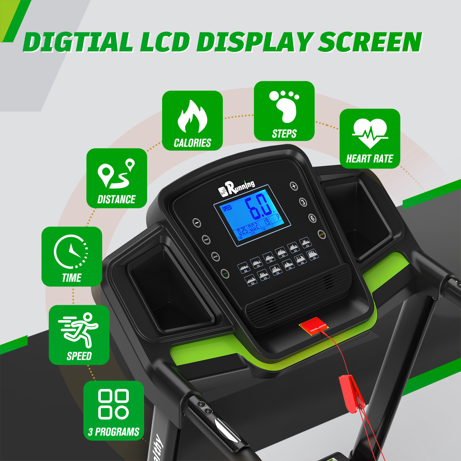 LED DISPLAY & HIGH QUALITY RUNNING AREA - ThIS compact treadmill has a clear LED screen that displays the running distance, running speed, running time, Calorie consumption, and heart rate in real time. A quick glance shows your current state of health. The running belt uses grass-like texture design, which brings anti-skid function and more comfortable running experience. The running area is 41.3"*16.5"