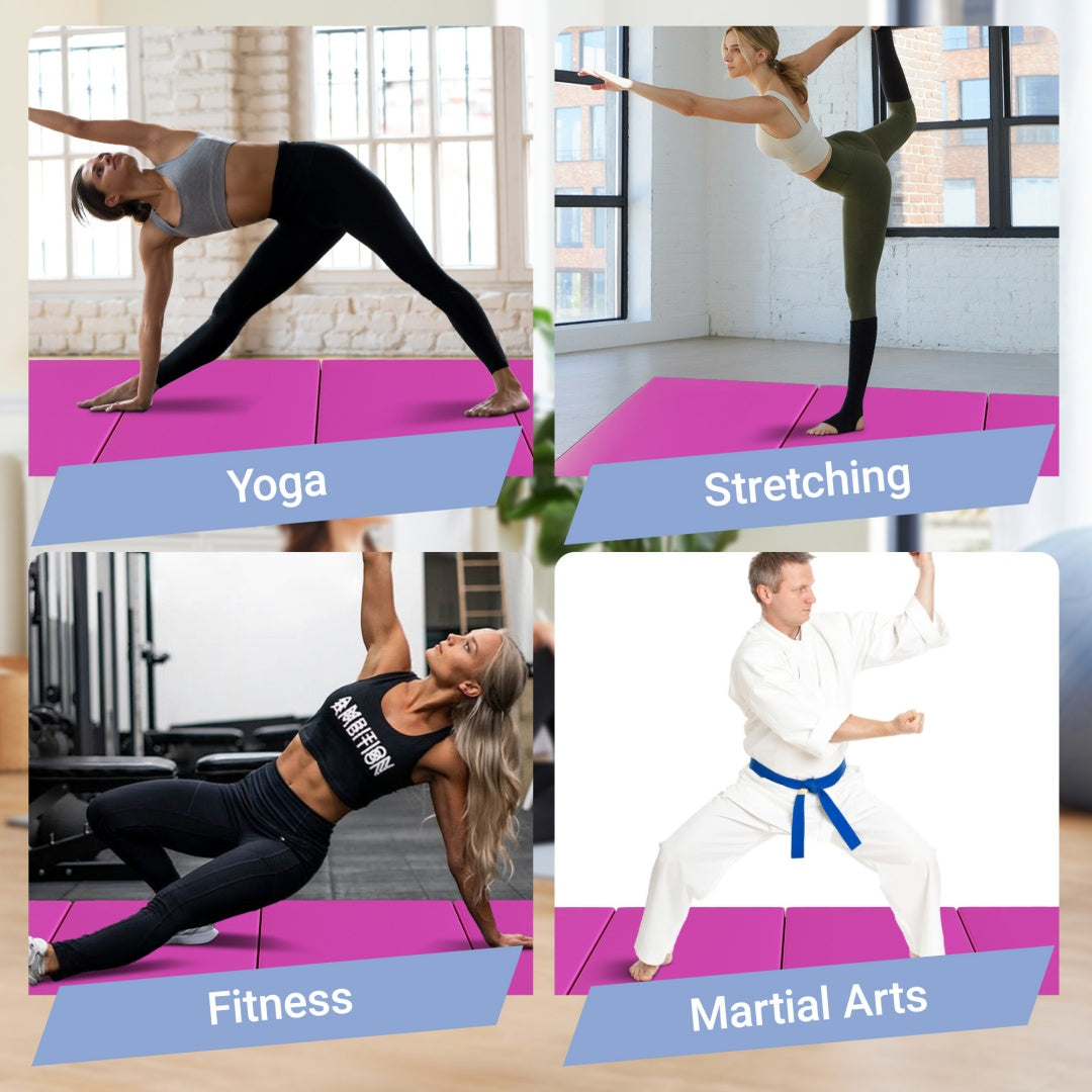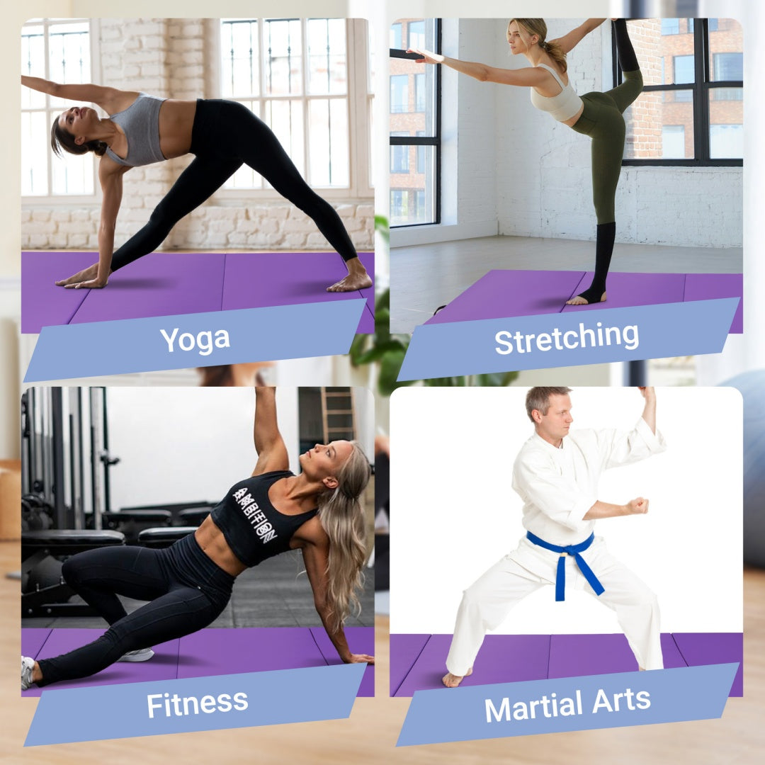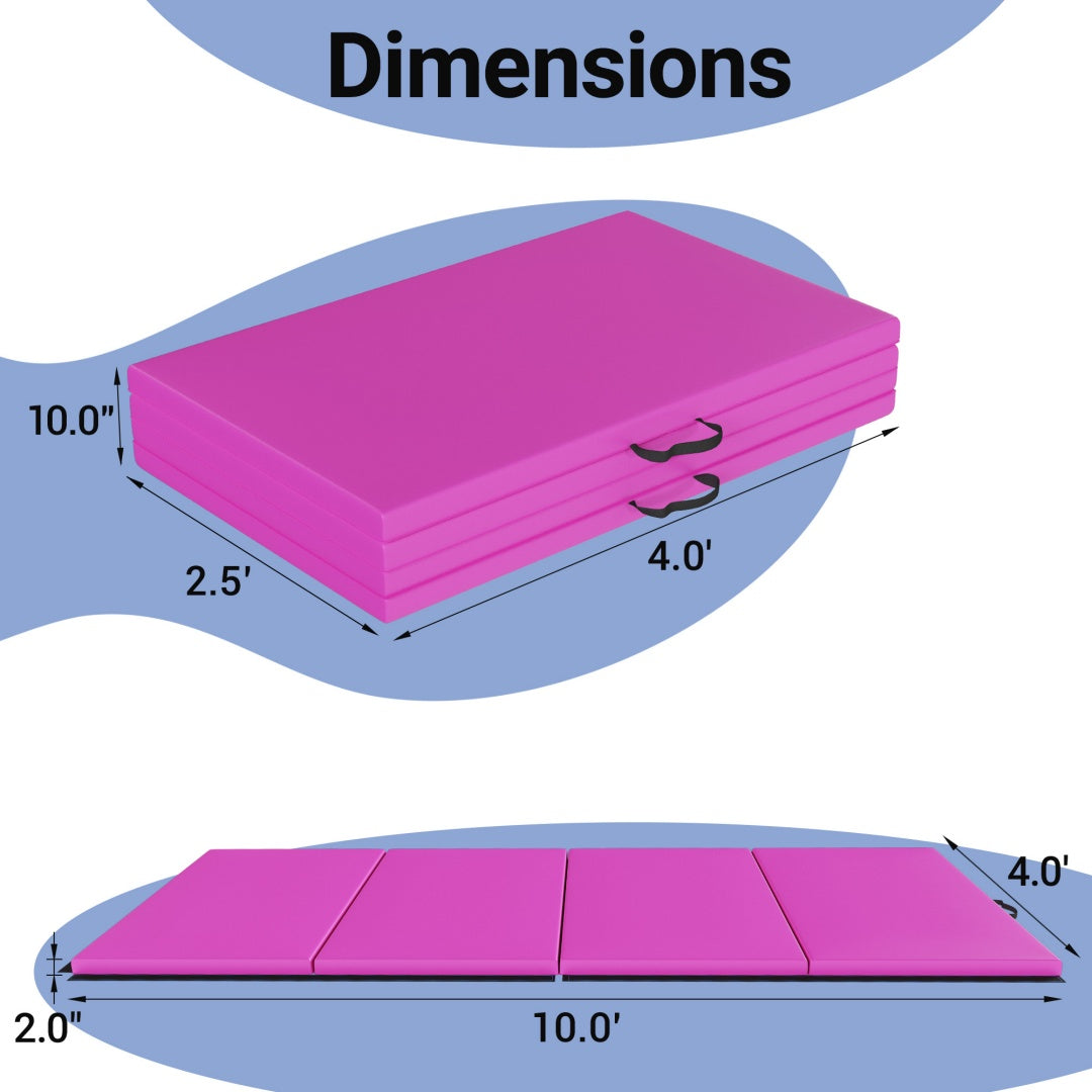 A foldable, 4 panel design and handles on each mat make it easy to store and Transport your mat. Expanded dimension: 10' x 4' x 2"; folded dimensions: 48" x 30" x 8"